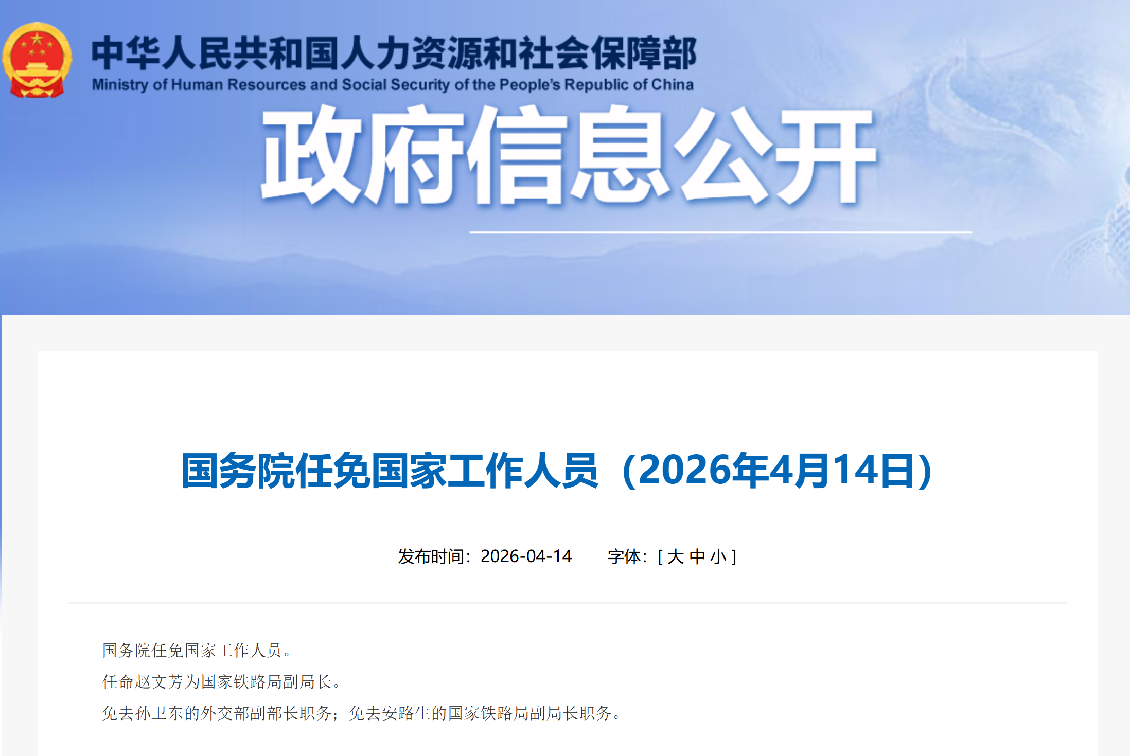 人社部网站4月14日消息,国务院任免国家工作人员,任命赵文芳为国家铁路局副局长。免去孙卫东的外交部副部长职务;免去安路生的国家铁路局副局长职务。