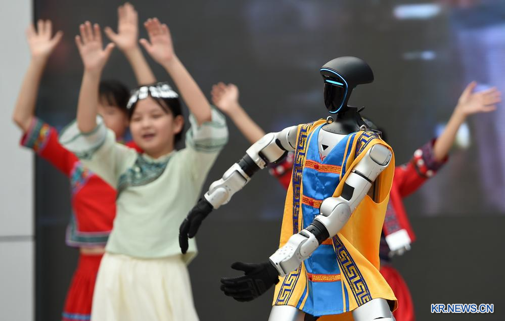 13일 광시(廣西) 난닝(南寧)시 빈후루(濱湖路)초등학교 교육그룹 빈후(滨湖)캠퍼스에서 로봇과 학생이 합동 공연을 펼치고 있다.