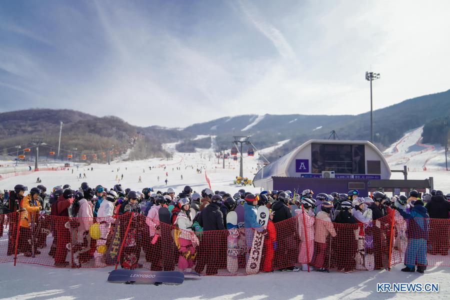 지난 2월 20일 지린(吉林)성 지린시에 위치한 중뤼(中旅) 쑹화후(松花湖)리조트에서 스키 애호가들이 케이블카를 타기 위해 줄을 서고 있다. (사진/신화통신)