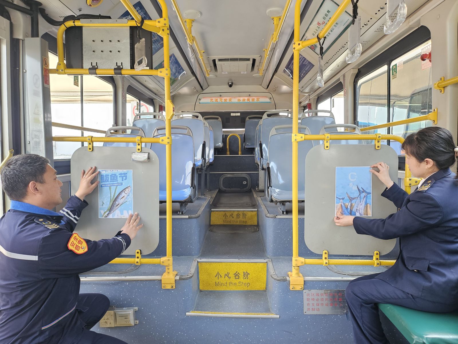 除了视觉上的巧思,车厢内还融入了贴心的服务细节。工作人员不仅对车厢进行了全面清洁消杀,更在乘车提示中加入了鲅鱼节出行小贴士,提醒乘客携带海鲜时做好密封防护,既保障乘车环境整洁,也为携带海鲜出行的市民提供便利。与此同时,车厢内还专门科普了“鲅鱼礼”的传统习俗——“送鲅鱼、孝父母”的岛城温情通过图文并茂的方式娓娓道来,让公交车不再是冷冰冰的出行工具,而成为传承民俗文化的移动窗口。