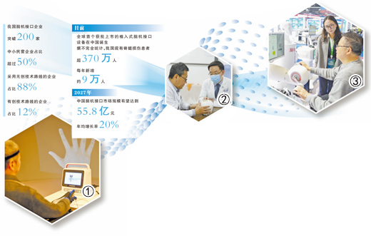 近日,首都医科大学附属北京天坛医院、首都医科大学宣武医院开展了“北脑一号”智能脑机系统植入手术。一片薄如蝉翼的电极集成了128个信号采集通道,被精准放置在控制手部运动的相应脑区,帮助脊髓损伤患者提高运动功能。“通过临床实践,脑机接口为脊髓损伤、脑卒中等患者带来了切实改善。”北京芯智达神经技术有限公司业务发展总监李园表示。