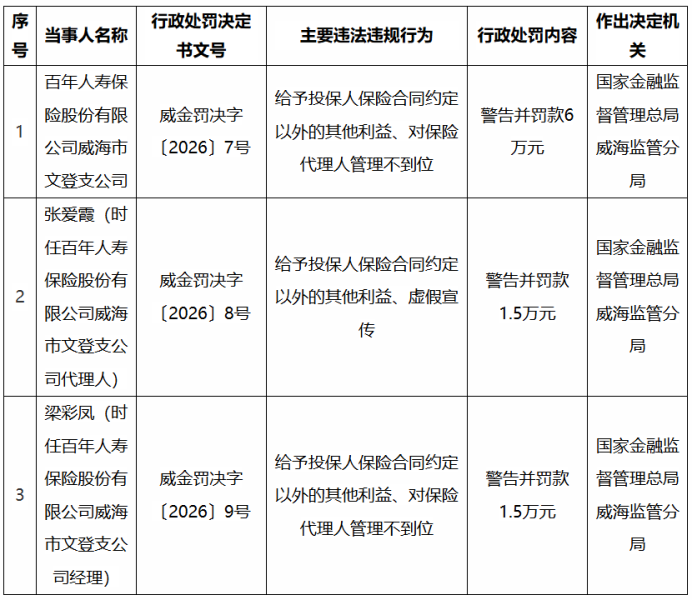 后者因给予投保人保险合同约定以外的其他利益、对保险代理人管理不到位,被警告并罚款6万元。同时,张爱霞(时任百年人寿保险股份有限公司威海市文登支公司代理人)因给予投保人保险合同约定以外的其他利益、虚假宣传被警告并罚款1.5万元;梁彩凤(时任百年人寿保险股份有限公司威海市文登支公司经理)被警告并罚款1.5万元。