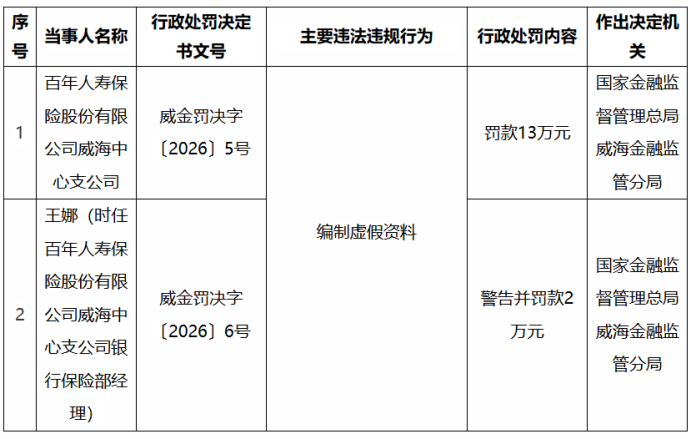 4月7日,国家金融监督管理总局山东监管局官网公示的行政处罚决定书(威金罚决字〔2026〕5号)和威金罚决字〔2026〕7号显示,百年人寿保险股份有限公司威海中心支公司和文登支公司同日因违法违规被处罚。其中前者因编制虚假资料被罚款13万元。同时,王娜(时任百年人寿保险股份有限公司威海中心支公司银行保险部经理)被警告并罚款2万元。