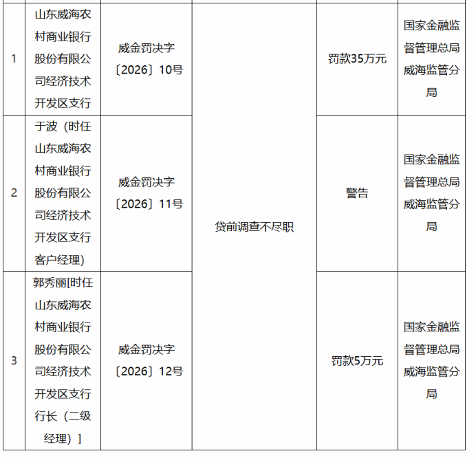 4月7日,国家金融监督管理总局山东监管局官网公示的行政处罚决定书(威金罚决字〔2026〕10号)显示,山东威海农村商业银行股份有限公司经济技术开发区支行因贷前调查不尽职被罚款35万元。同时,于波(时任山东威海农村商业银行股份有限公司经济技术开发区支行客户经理)被警告,郭秀丽[时任山东威海农村商业银行股份有限公司经济技术开发区支行行长(二级经理)]被警告并罚款5万元。
