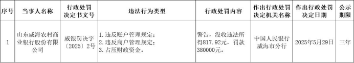记者注意到,此次并非威海农商商业银行首次因违法违规被处罚。2025年6月,中国人民银行威海市分行披露处罚决定信息公示表,因违反账户管理规定、违反商户管理规定、占压财政资金,山东威海农村商业银行被警告,并没收违法所得817.92元,罚款38万元。