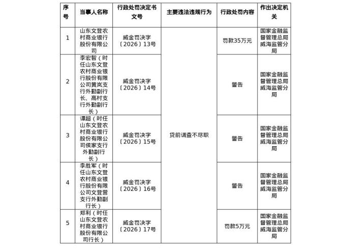 4月7日,国家金融监督管理总局山东监管局官网公示的行政处罚决定书(威金罚决字〔2026〕13号)显示,山东文登农村商业银行股份有限公司因贷前调查不尽职被罚款35万元。