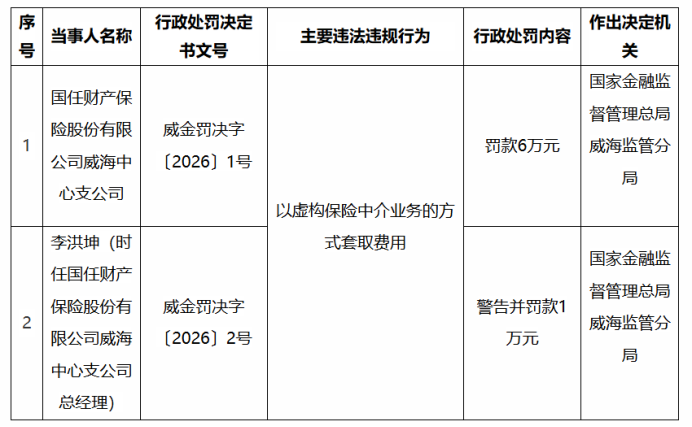 4月7日,国家金融监督管理总局山东监管局官网公示的行政处罚决定书显示,国任财产保险股份有限公司威海中心支公司因虚构保险中介业务的方式套取费用被罚款6万元。李洪坤(时任国任财产保险股份有限公司威海中心支公司总经理)被警告并罚款1万元。