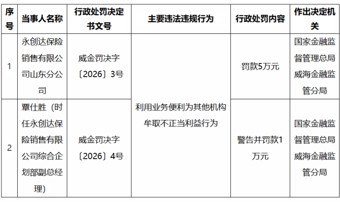 4月7日,国家金融监督管理总局山东监管局官网公示的行政处罚决定书(威金罚决字〔2026〕3号)显示,永创达保险销售有限公司山东分公司因利用业务便利为其他机构牟取不正当利益行为被罚款5万元,覃仕胜(时任永创达保险销售有限公司综合企划部副总经理)被警告并罚款1万元。