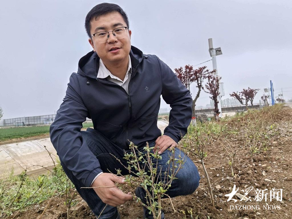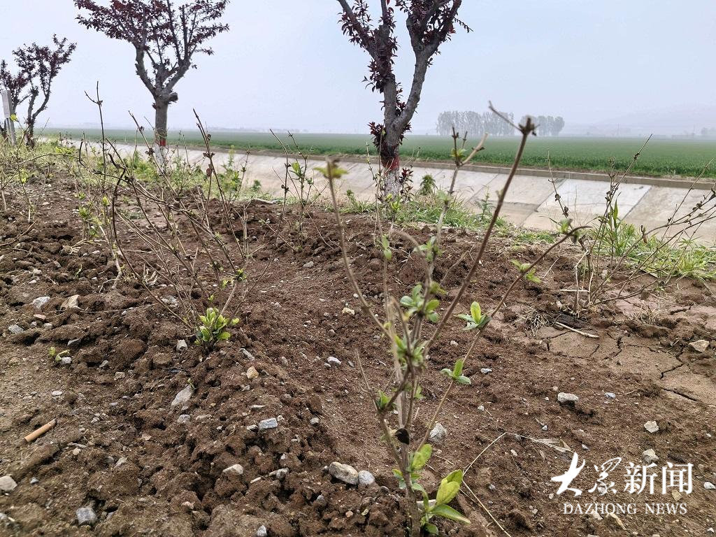 进军渠道路两侧一株株带着嫩绿新芽的金银花幼苗整齐排开。