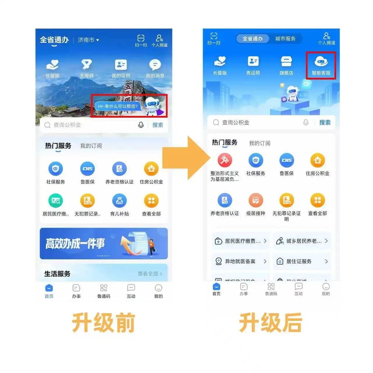 为持续优化用户办事服务体验,提升平台使用便捷度,新版本重点升级交互服务能力。在便民服务方面,新版本将智能客服入口调整至“金刚区”核心位置,优化入口标识设计,简化用户查找流程。用户可在首页一键直达客服咨询通道,及时解答办事疑问,有效提升咨询响应效率,全面优化用户办事体验。