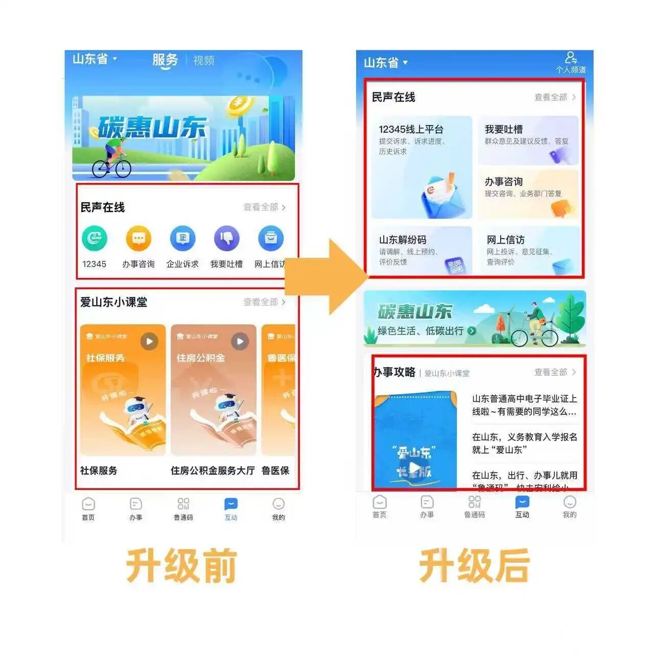 此外,新版本针对“民声在线”“爱山东小课堂”“我的证照”“我的办件”等界面的布局与交互设计进行了优化,让使用逻辑更清晰、视觉呈现更直观。