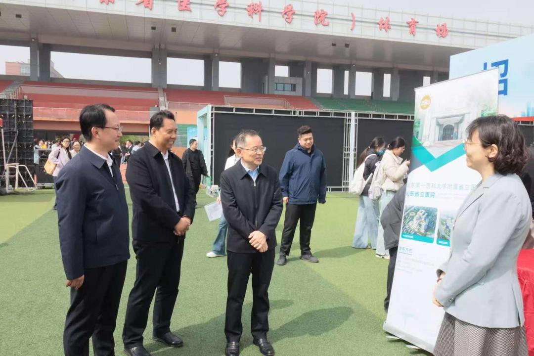 4月10日上午,“选择济南 共赢未来”2026年驻济高校毕业生就业双选会暨山东第一医科大学(山东省医学科学院)2026年春季校园双选会在济南校区体育场举办。本次双选会同步开展直播带岗、AI数智就业、简历诊断等多元服务活动,山东省人力资源和社会保障厅公共就业和人才服务中心就业服务处刘容秀,山东省卫生健康委员会科教处副处长孟勇,济南市人力资源和社会保障局党组成员、市公共就业服务中心主任王振群到场指导工作,校(院)党委副书记王宇轩,党委委员、副校(院)长贾海宁出席活动。