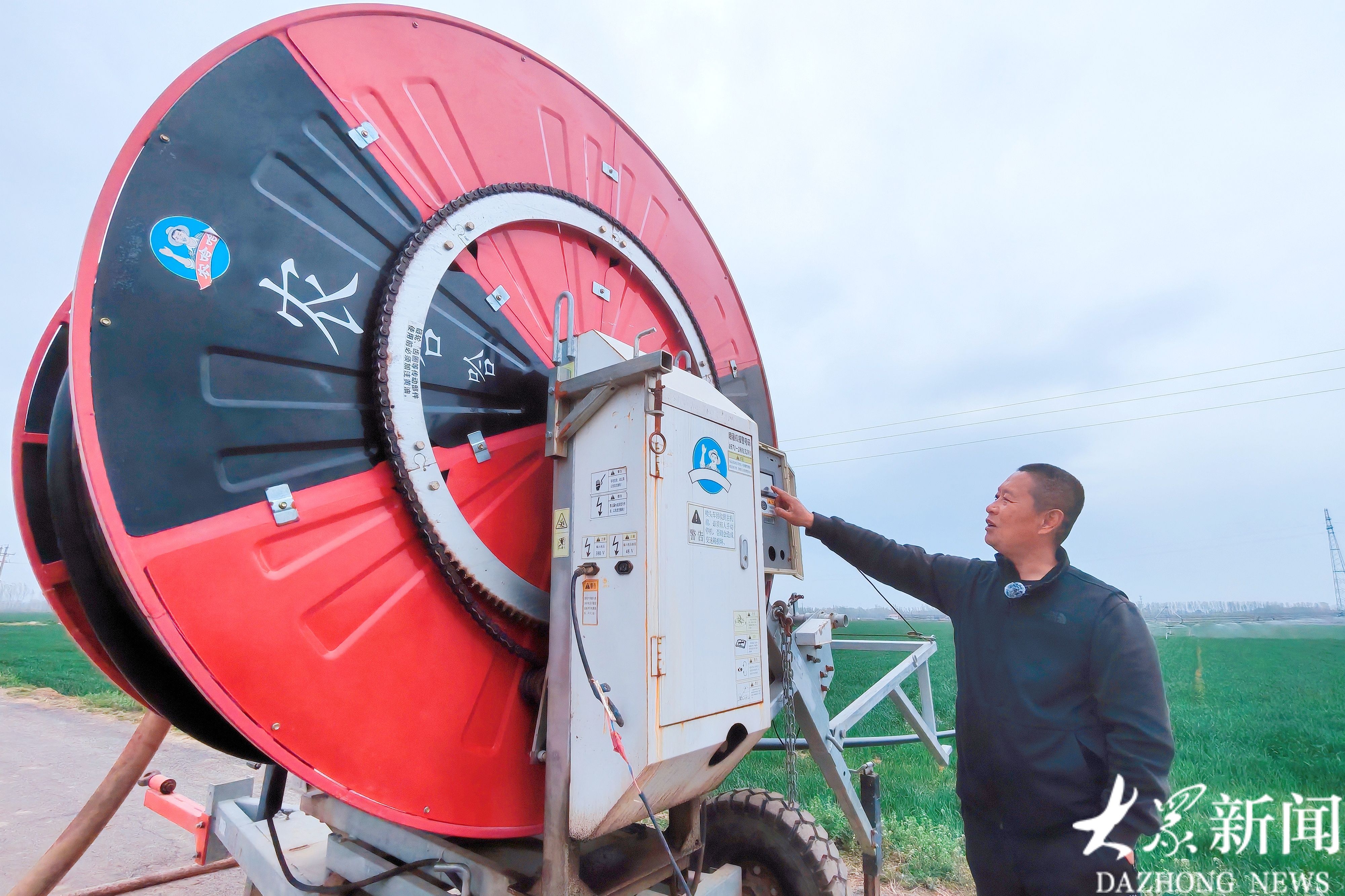 4月3日,在德州市宁津县千顷家庭农场,种粮大户王学刚在设定自动化卷盘式喷灌机参数。