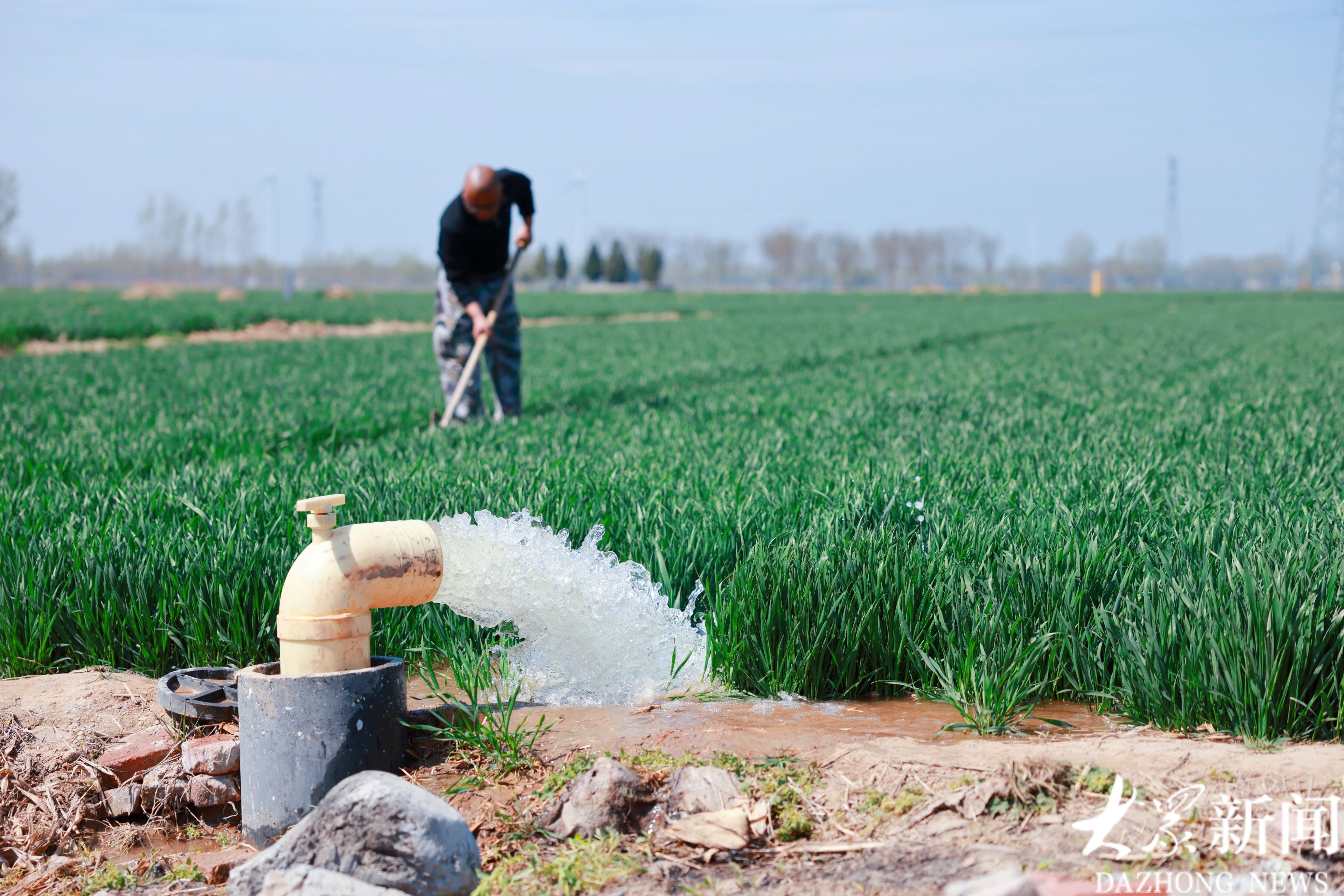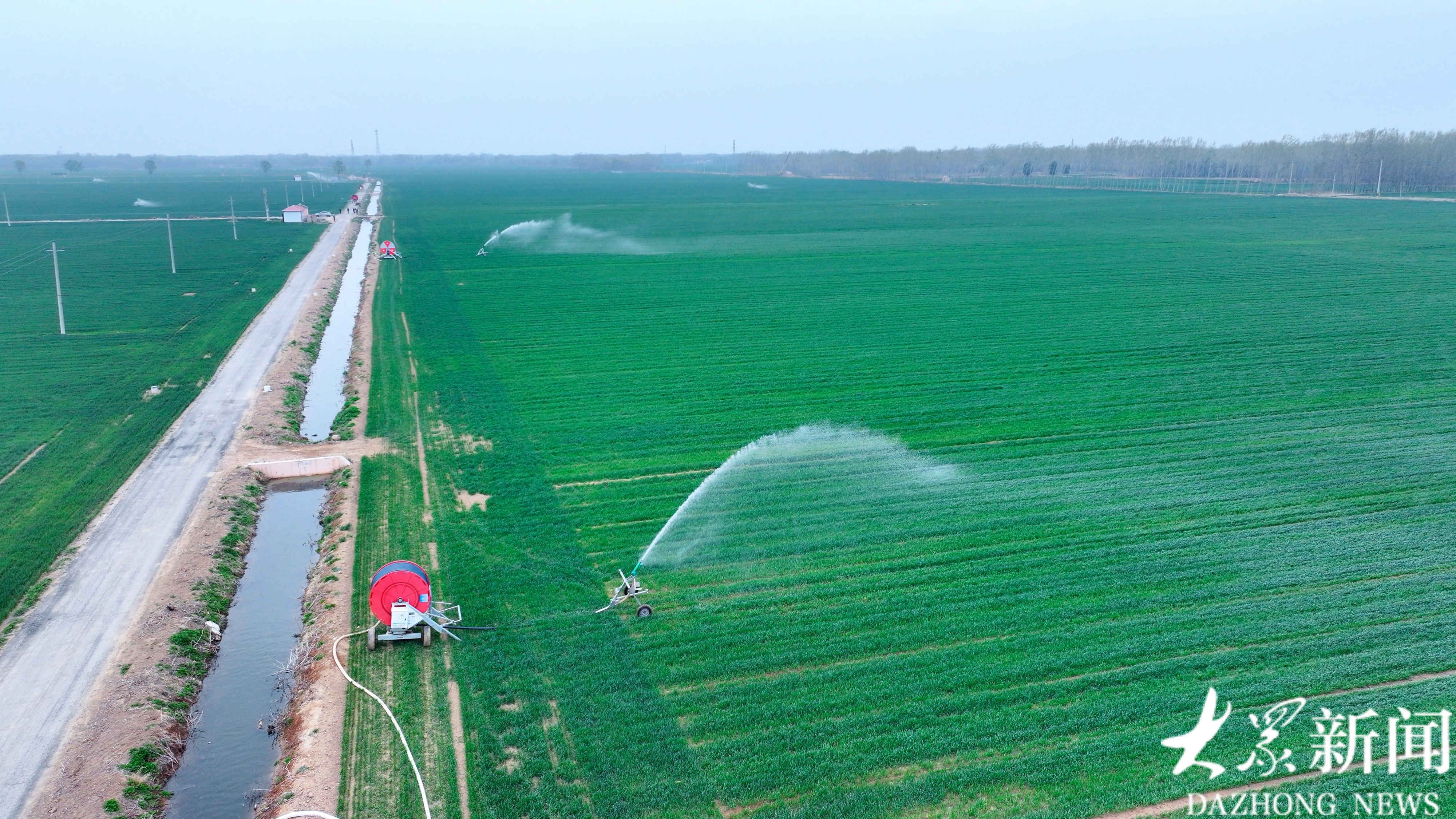 4月9日,在聊城市阳谷县石佛镇一高标准农田,万亩麦田正在浇灌。
