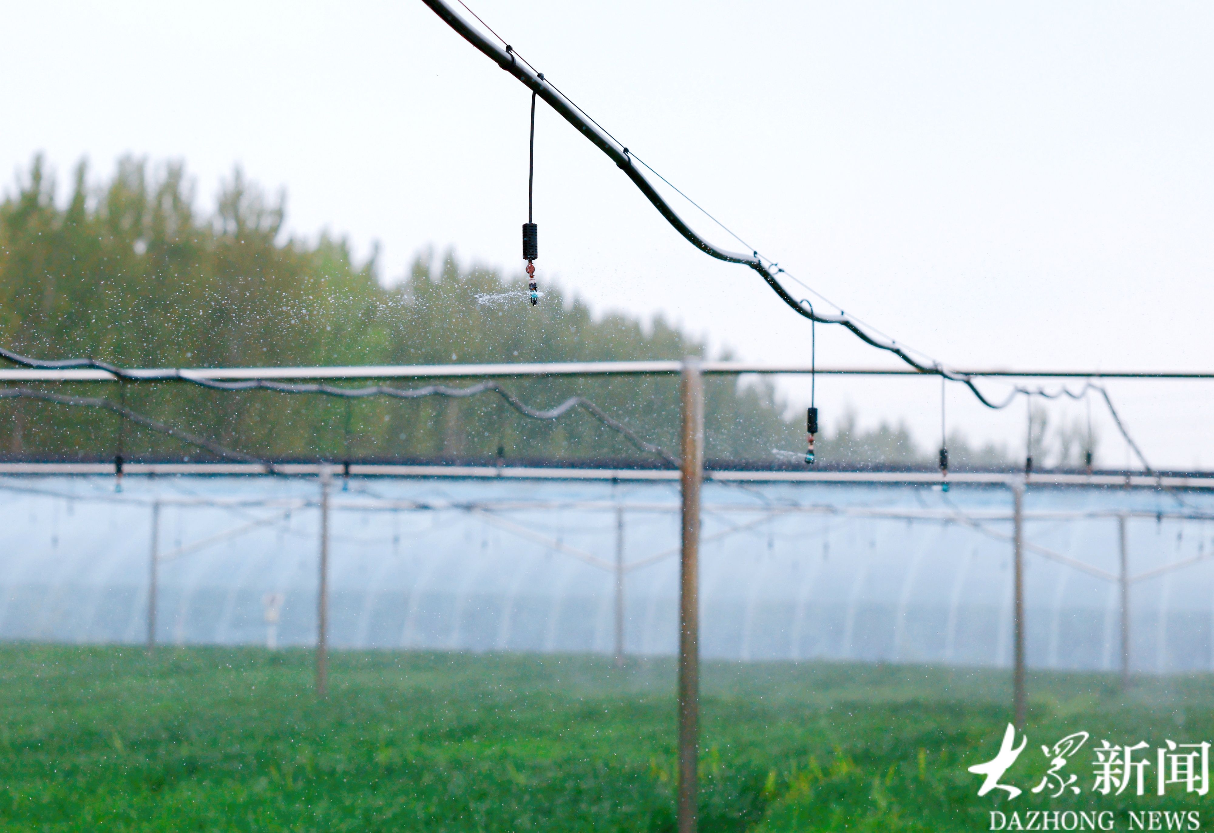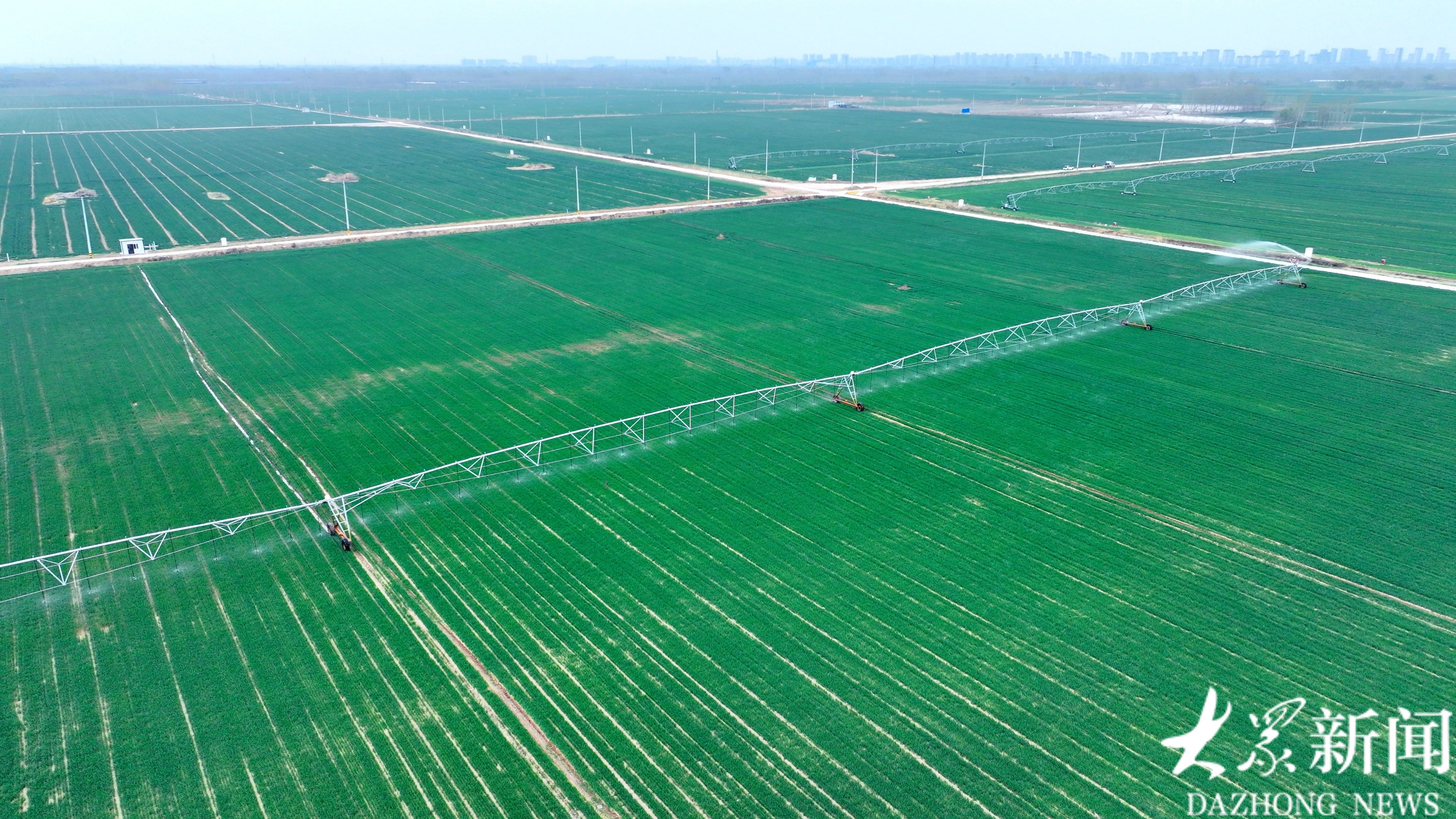 当日,在宁津县民天农谷现代农业产业园,桁架式喷灌机在浇麦田,这是一种高效节水灌溉设备,通过桁架结构支撑喷头进行大面积均匀喷洒,广泛应用于农田、牧场及绿地灌溉,具备自动化程度高、水肥一体化及节省人工等显著优势。