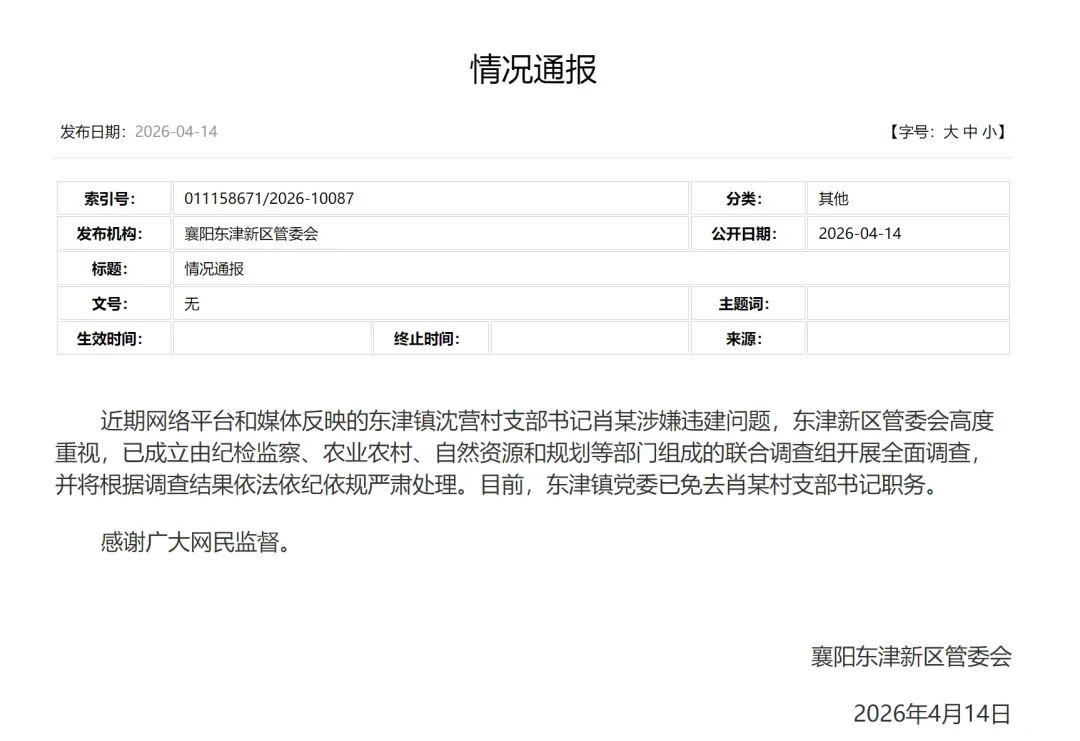 湖北省襄阳东津新区管委会4月14日发布情况通报: