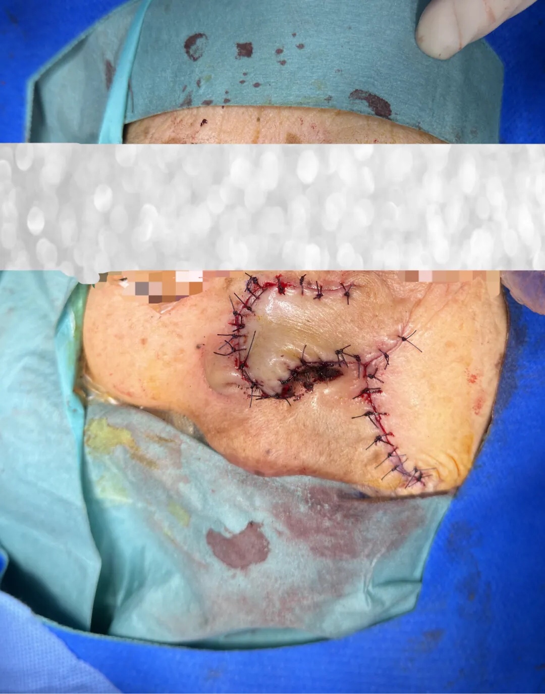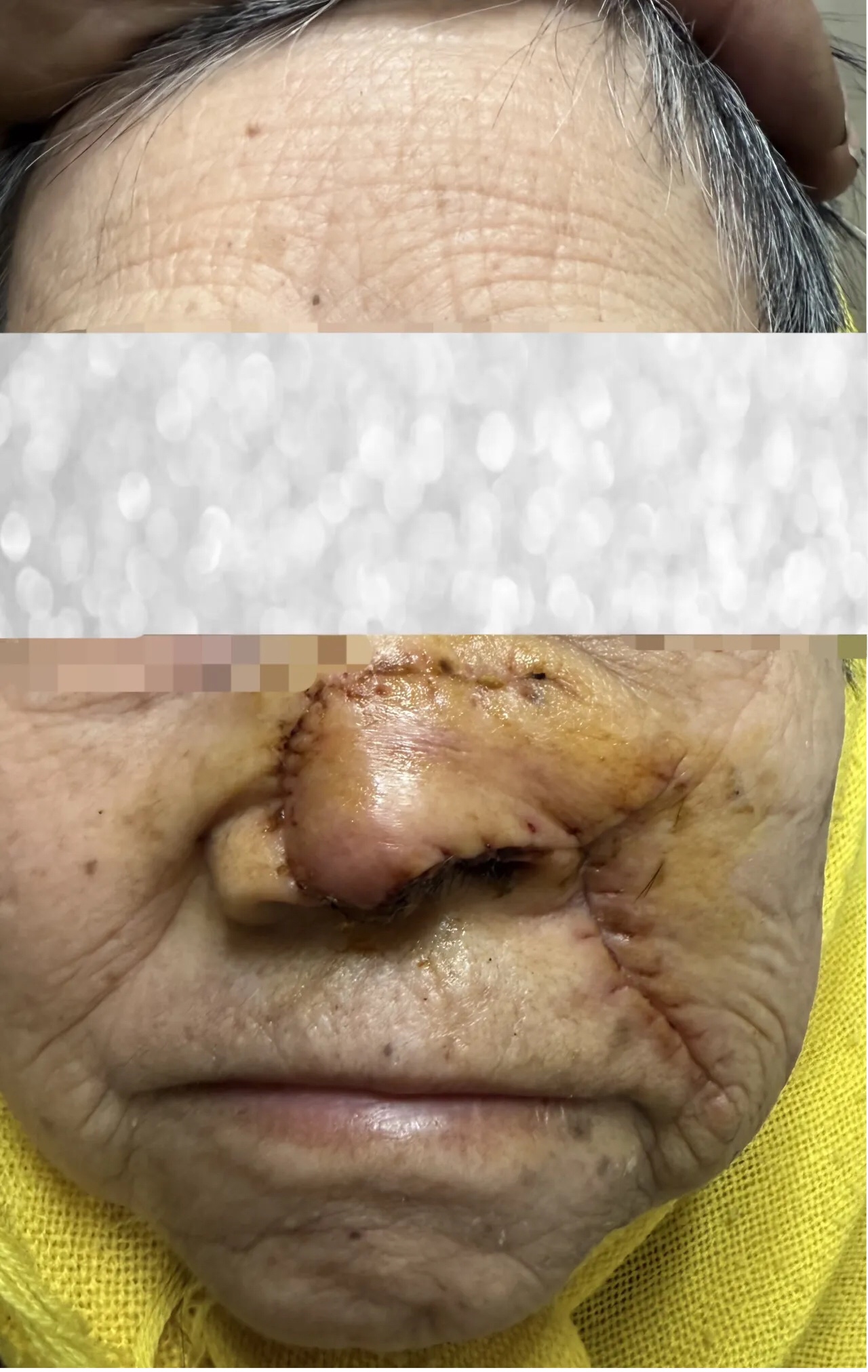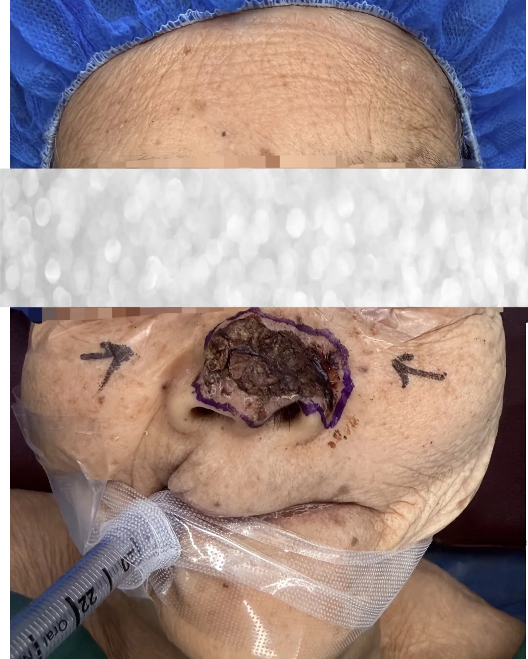 但是,患者的手术面临多重严峻挑战:高龄与基础病风险:患者年近八旬,基础疾病较多、全身基础条件差,对麻醉和手术的耐受度极低,围手术期心脑血管意外、感染等风险显著升高;肿瘤切除的精准性要求:鼻部位于面部核心区域,既要保证肿瘤完整切除、切缘阴性,从根源上杜绝复发,又要最大限度保留正常组织,为后续外形重建创造条件;外形重建的高难度:鼻部是面部美学的核心结构,切除后会形成大面积皮肤软组织缺损,无法直接缝合、且会导致严重的面部畸形、鼻功能受损,必须通过皮瓣转移实现缺损修复,同时要兼顾美观与功能,手术精度要求极高。