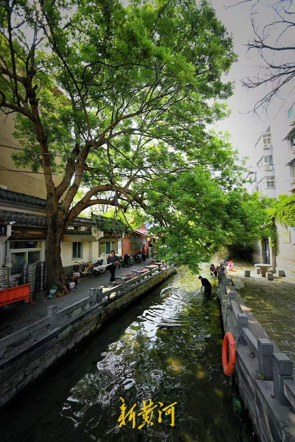 4月13日,春天的于家桥已是一片翠绿,清冽的泉水缓缓流淌,水草随水流轻轻摇摆,午时,不少附近居民在河边喝起扎啤纳凉。于家桥位于济南市天桥区铜元局后街,这里常年流淌着从五龙潭泉群向北流出的泉水,为枕河而居的人们提供着各种方便。