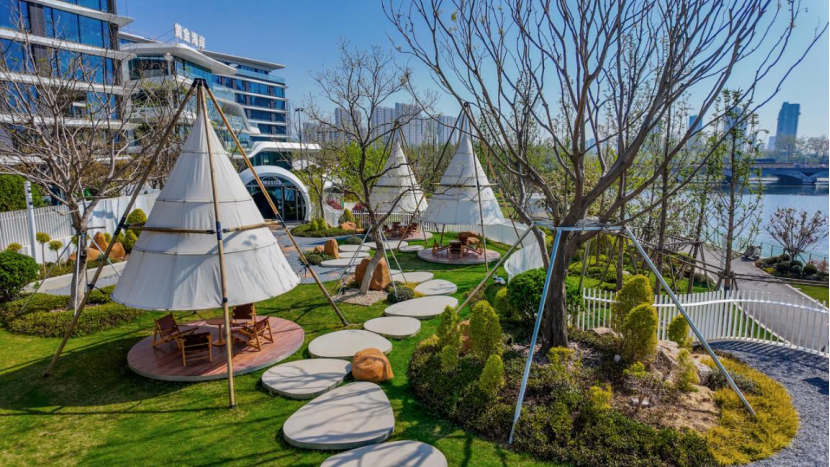 草坪新绿浸染,太空舱烧烤区香气弥漫,孩子们追逐风筝,大人围坐天幕煮春茶闲话。悬挑河畔的观景平台,复刻普吉岛鸟笼酒店设计,远眺波光粼粼的河面,春风拂面间,仿佛置身黄金海岸度假岛屿。这里无需精心策划远行,随时解锁“度假感”生活现场。