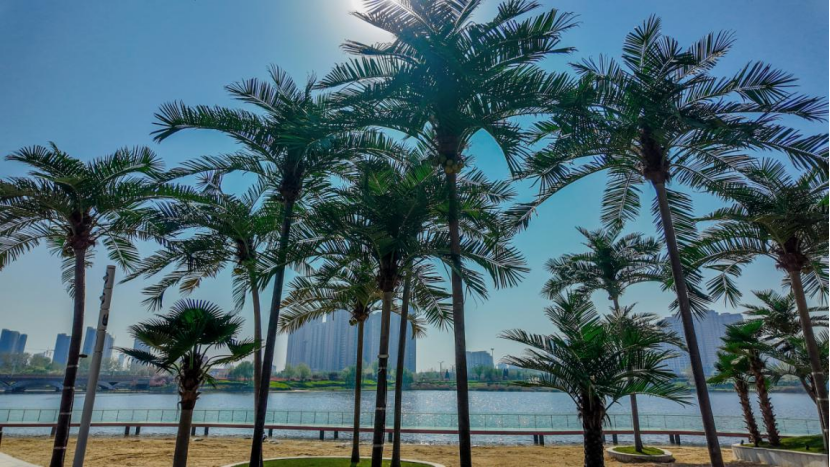 沿蜿蜒小径深入,椰林摇曳、碧波粼粼,玻璃栈道延伸至水面,漫步间河岸温润空气包裹身心。赵王河水轻拍岸边,与椰林沙沙声交织成自然乐章。吊床或躺椅上,捧书静读或闭目养神,阳光透过椰叶洒下斑驳光影,时间慢到能听见自己的呼吸,这是黄金海岸业主的专属松弛日常。