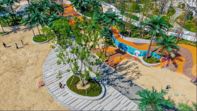 以澳大利亚黄金海岸为灵感,柔软沙滩与翻涌浪花勾勒热带浪漫。孩童筑沙堡、挖螃蟹享赶海乐趣,大人躺沙滩椅沐日光浴,或参与即兴沙滩排球。春日午后椰林投下斑驳影子,微风裹挟河水清凉,每一天都是“放风大会”,让忙碌随心情一同晾晒。