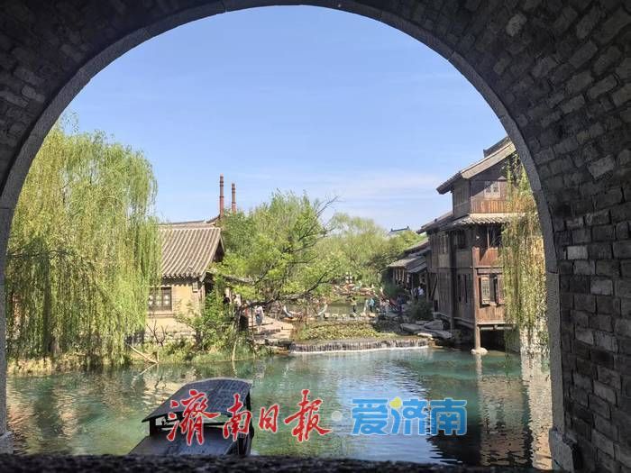 “人间四月芳菲尽”,而济南章丘明水古城内,春色依然浓郁。4月12日,这座依托百脉泉域打造的文旅地标,呈现出小桥流水、绿柳依依的春日画卷。城中连翘、紫藤栽植不算繁密,但正值花期,金黄与淡紫点缀于墙角水畔,疏朗有致,与古建、碧水相映成趣。石桥卧波,水巷蜿蜒,摇橹船穿行其间,构成一幅宁静而富有韵味的“北方水乡”图景。