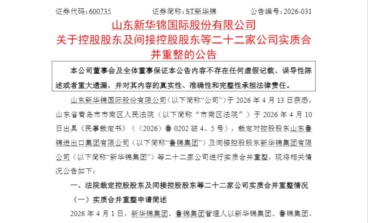 4月13日晚,ST新华锦(600735.SH)公告称,公司当日获悉,山东省青岛市市南区人民法院(下称“市南区法院”)于4月10日出具《民事裁定书》,裁定对控股股东山东鲁锦进出口集团有限公司(下称“鲁锦集团”)及间接控股股东新华锦集团有限公司(下称“新华锦集团”)等22家公司进行实质合并重整。