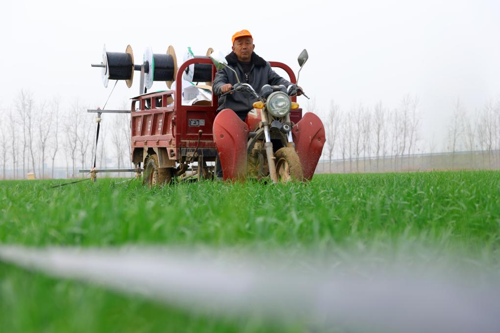 3月23日,在山东省聊城市茌平区冯官屯镇,农民给小麦铺设滴灌带。新华社发(马红坤摄)