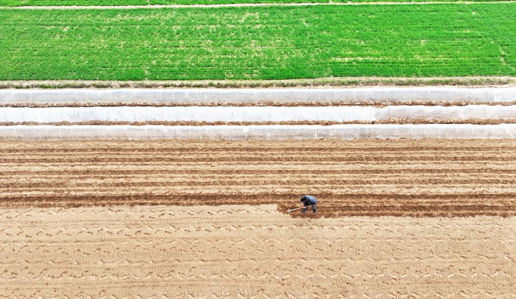 3月23日,在山东省临沂市郯城县郯城街道,农民在田间劳作(无人机照片)。新华社发(张春雷摄)