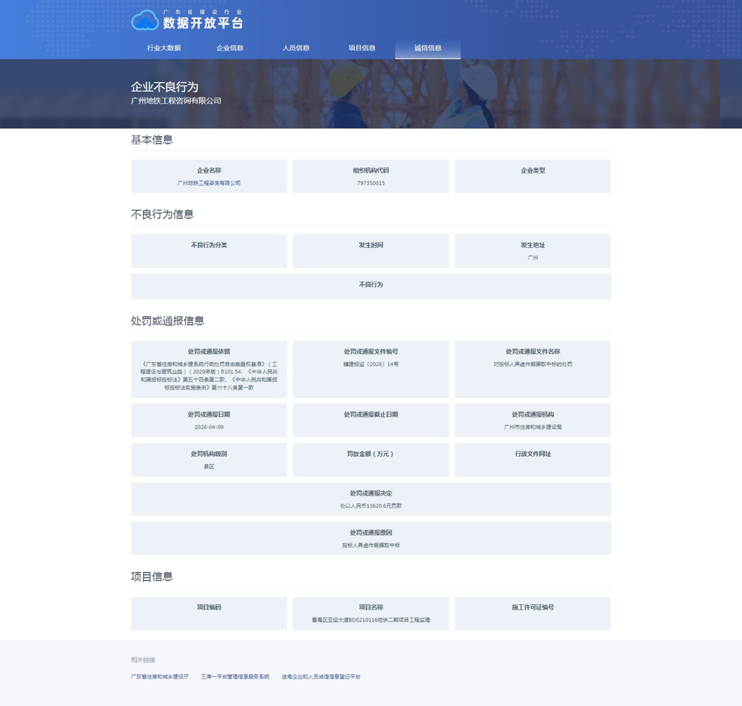 齐鲁晚报·齐鲁壹点记者于广东省建设行业数据开放平台获悉,4月9日,地铁设计(003013.SZ)旗下的广州地铁工程咨询有限公司(下称“广州地铁工程咨询公司”)被行政处罚。文号:穗建招监〔2026〕14号。