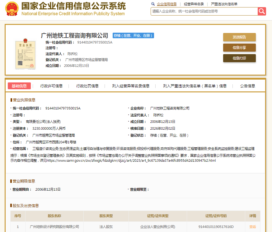 国家企业信用信息公示系统显示,广州地铁工程咨询有限公司成立于2006年,注册资本3230万元人民币,法定代表人为陈乔松,由地铁设计(003013.SZ)全资持股。