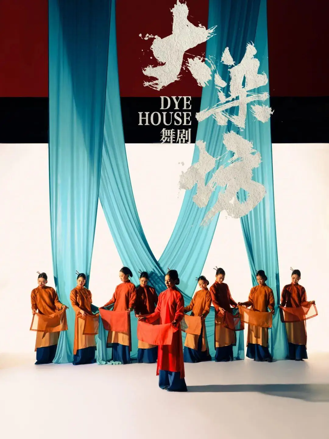 全剧高潮在“灰布”与“黄布”的抉择中到来。1937年,抗日战争全面爆发,济南沦陷,藤井逼迫陈寿亭为日军染制军装,而卢家驹难抑救国之心,暗中接下八路军灰布订单。此时,布匹的颜色早已超越物质本身,成为民族大义与生死抉择的象征。当陈寿亭最终选择坚守民族气节,拒绝为侵略者效力,毅然将染坊付之一炬时,漫天飞舞的红色布匹骤然铺满舞台,整体意象极具冲击力,大片的赤红象征着热血、牺牲与不屈的民族魂,舞者们以顶天立地的姿态完成最后的群舞,将全剧的家国情怀推向极致。