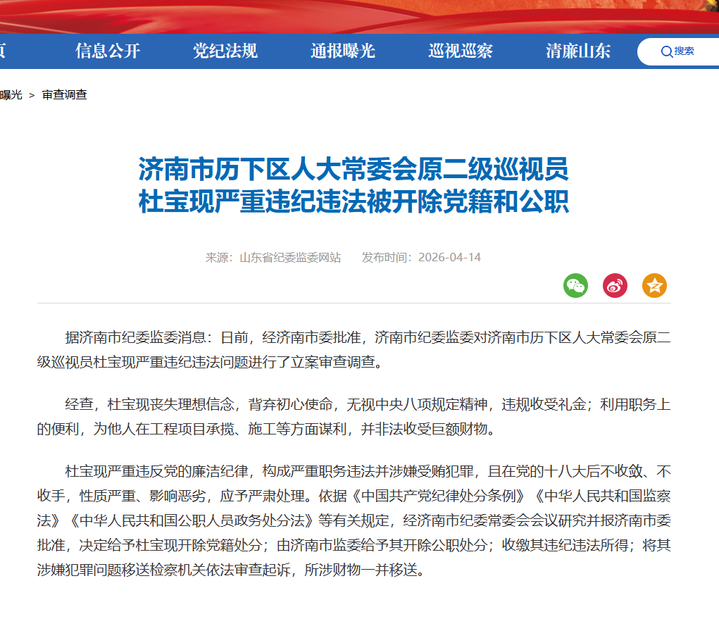 据济南市纪委监委消息:日前,经济南市委批准,济南市纪委监委对济南市历下区人大常委会原二级巡视员杜宝现严重违纪违法问题进行了立案审查调查。
