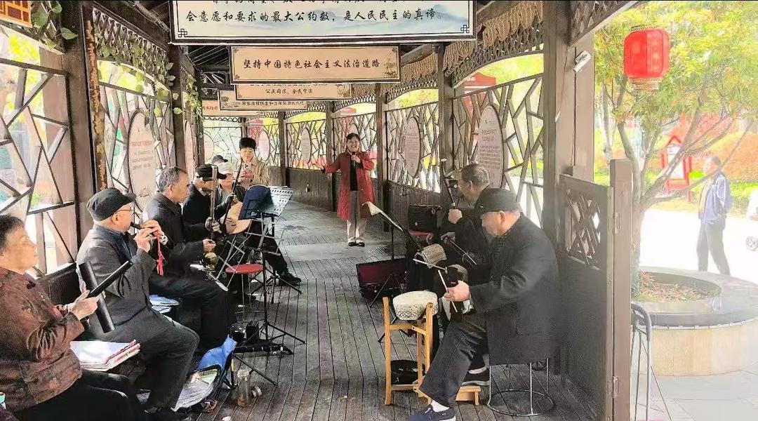 在各小区户外文化长廊、文体小广场、书吧等区域,离退休老干部与文艺爱好者自发相聚,三两结伴、自由组队,既是演员也是观众,自娱自乐,雅俗共赏。有的拉起二胡、敲起锣鼓,有的自编自演、和曲高歌,有的静坐沉思、回味韵律。一曲曲耳熟能详的经典戏曲,一声声婉转悠扬的古典唱腔,随风飘荡,细品悠长;小桥流水与古韵琴声相伴相随,经典唱段与居民表演轮番上演,韵味十足,吸引了众多居民驻足观看并积极参与。大家以饱满热情歌唱美好生活,抒发愉悦心情;摆脱了室内空间的束缚,老年朋友们的娱乐活动更加尽兴,彼此交流也更为顺畅,欢声笑语不断回荡在社区上空,营造出“竹韵琴声、儒雅桃李、晴耕雨读”的文化氛围,一幅温馨和谐的幸福画卷徐徐展开。
