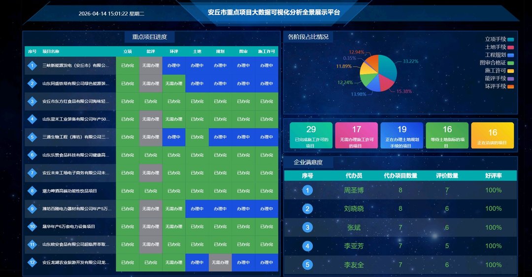 安丘行政审批服务局、安丘发改局梳理项目名录,清理历史数据、重构管理模块,建立独立台账,2026年以来已动态更新项目审批数据超100次,为精准帮办提供坚实数据支撑。拓展“云帮办・主动办”精准预警机制,对审批滞后事项自动预警,分类处置跨部门协调、材料完善等问题,推动项目手续办理效率提升30%以上。