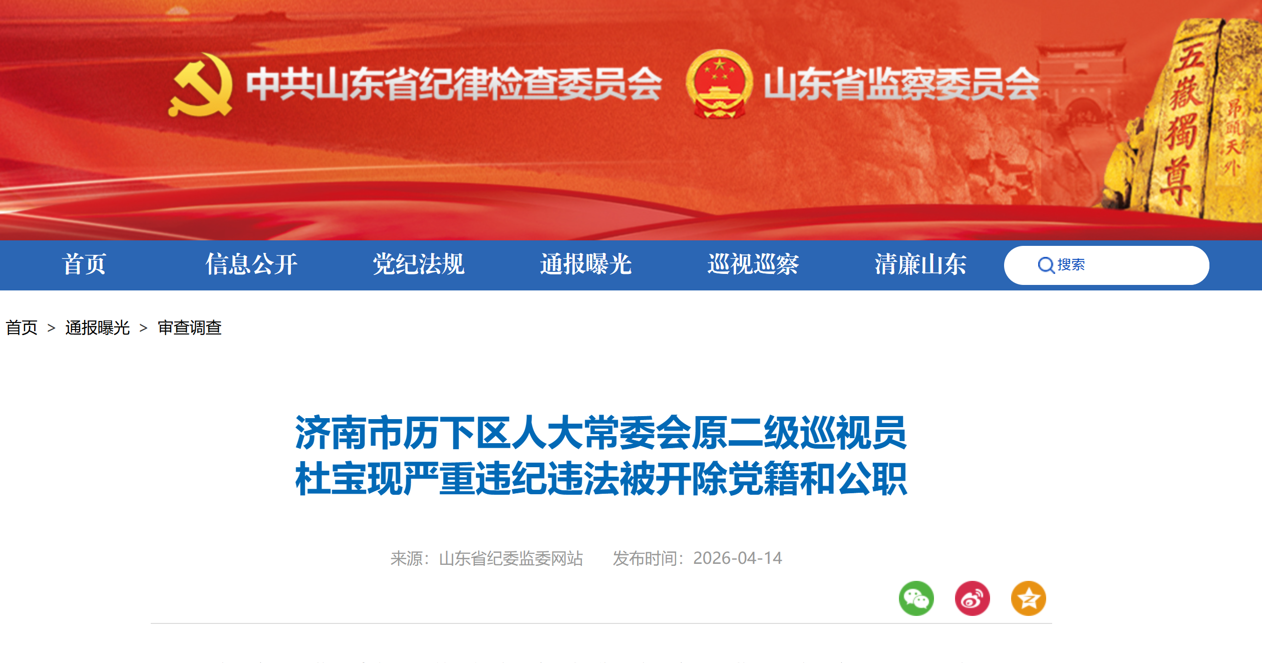 山东省纪委监委网站4月14日消息,济南市历下区人大常委会原二级巡视员杜宝现被开除党籍和公职。