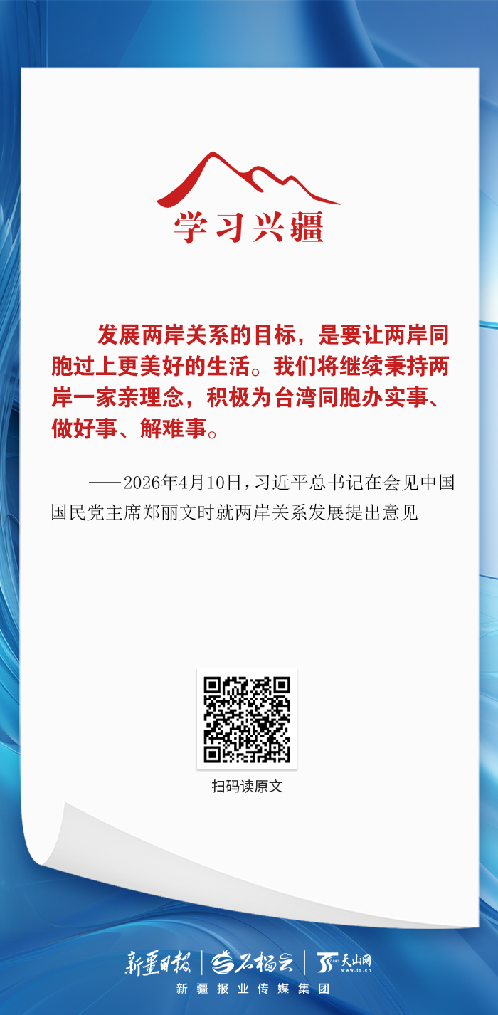 发展两岸关系的目标,是要让两岸同胞过上更美好的生活。我们将继续秉持两岸一家亲理念,积极为台湾同胞办实事、做好事、解难事。——2026年4月10日,习近平总书记在会见中国国民党主席郑丽文时就两岸关系发展提出意见