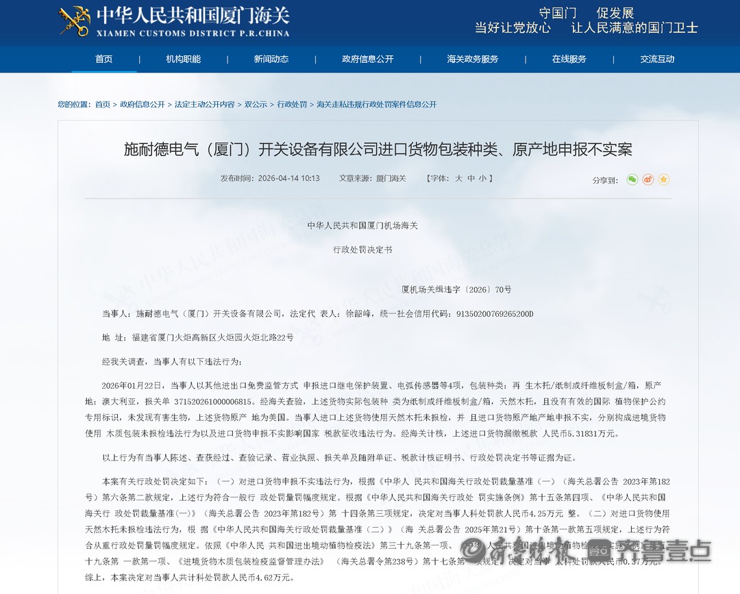 4月14日,中华人民共和国厦门机场海关发布关于对施耐德电气(厦门)开关设备有限公司进口货物包装种类、原产地申报不实案的行政处罚决定。