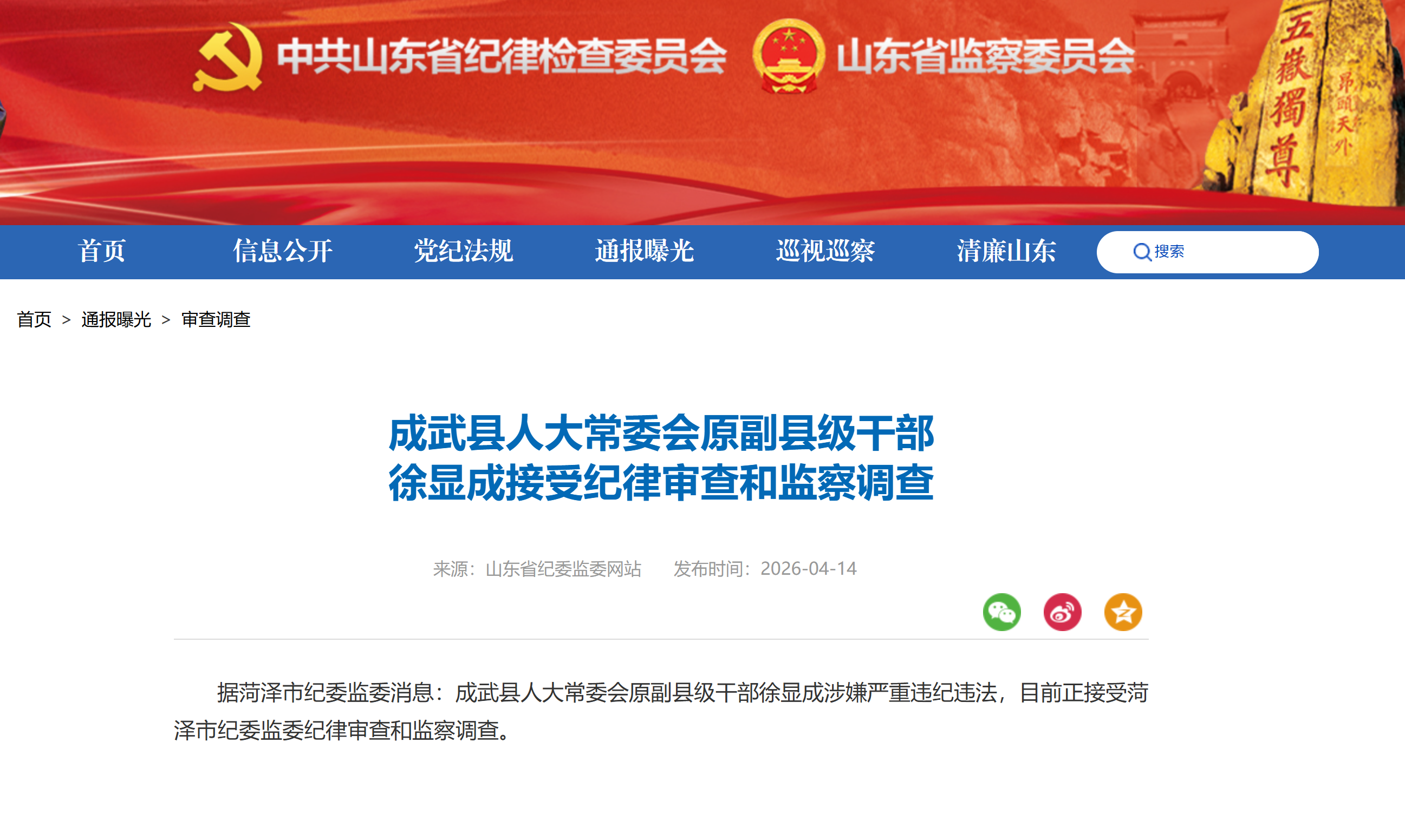 山东省纪委监委网站4月14日消息,成武县人大常委会原副县级干部徐显成涉嫌严重违纪违法,目前正接受菏泽市纪委监委纪律审查和监察调查。
