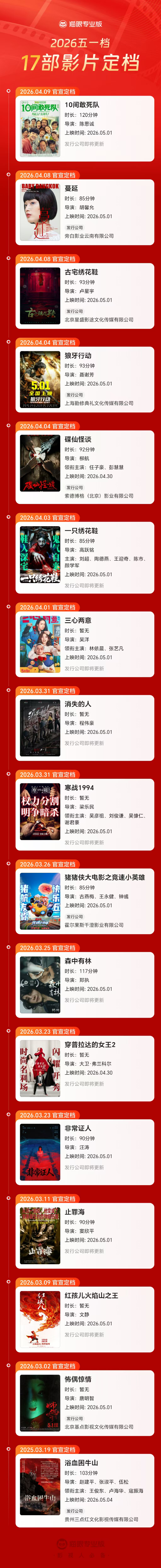 17部新片扎堆定档五一档。