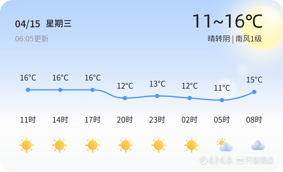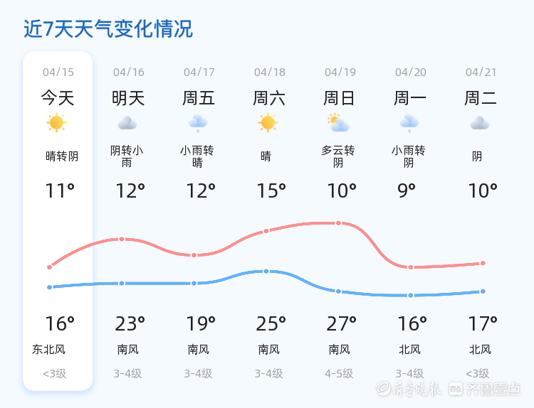 明天(4月16日)天气将由阴转小雨,气温较今日有所上升,最低气温12℃,最高气温23℃,风力增大,南风3-4级。市民需注意携带雨具,防范降雨对出行的影响。