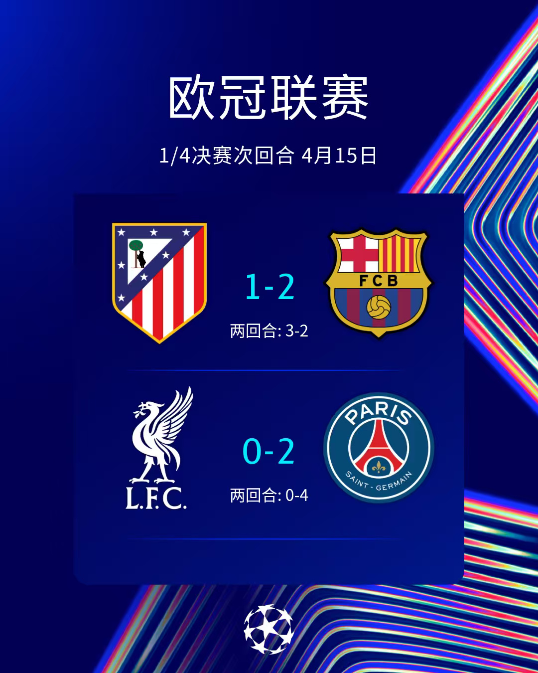北京时间4月15日凌晨,欧冠联赛1/4决赛次回合比赛结束了两场争夺。两支在首回合赢球的队伍,在次回合均守住了他们的优势。卫冕冠军巴黎圣日耳曼总比分4-0淘汰利物浦,连续3年跻身欧冠四强。马德里竞技总比分3-2力挫巴塞罗那,9年后重返欧冠四强。