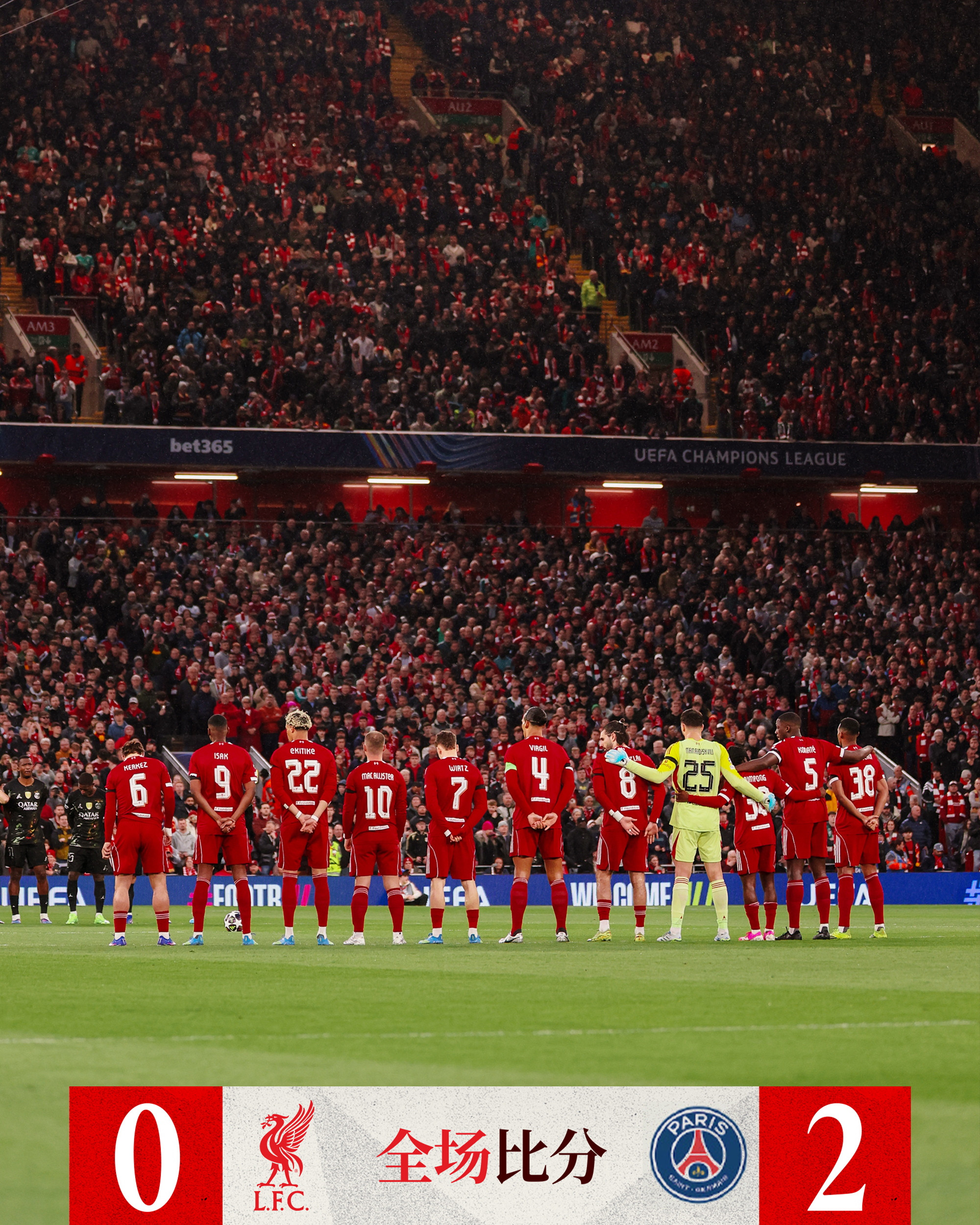 利物浦0-2巴黎圣日耳曼(首回合0-2,总比分0-4)