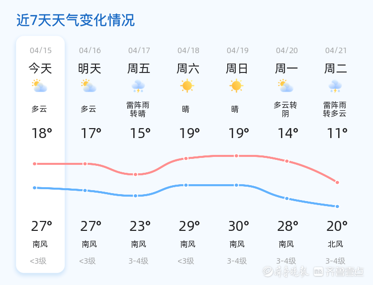 今天是2026年4月15日,星期三,农历二月廿八。济南市今日天气多云,气温在18℃至27℃之间,东南风2级,空气湿度为78%,PM2.5指数63。各区天气情况基本一致,整体以多云为主,温度适中,适合市民外出活动。