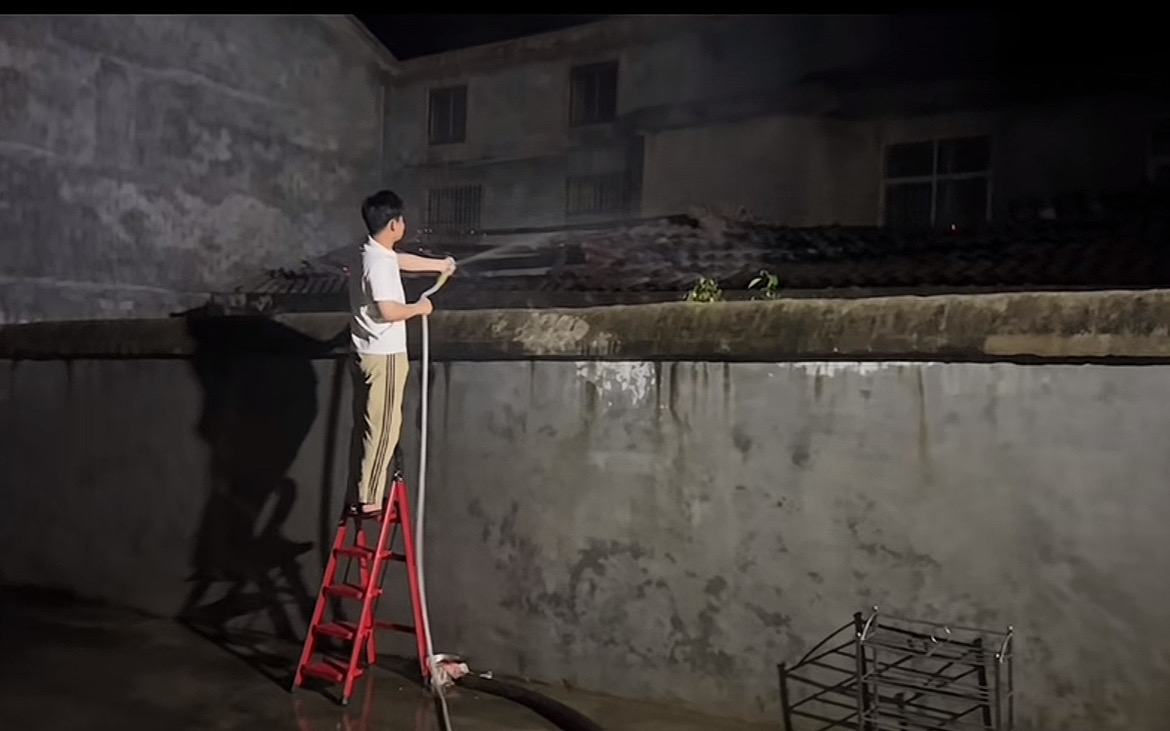18岁小伙在家打游戏听到外面异响,开门发现邻居老人家起火!拎上洗车水管就冲