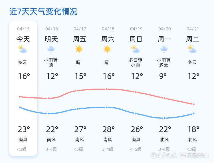 明天4月16日,聊城天气将由小雨转晴,气温较今日有所下降,最低气温12℃,最高气温22℃,风力增大至3-4级。相较于今日,明日天气变化较大,市民需注意防范降雨和风力变化带来的影响。