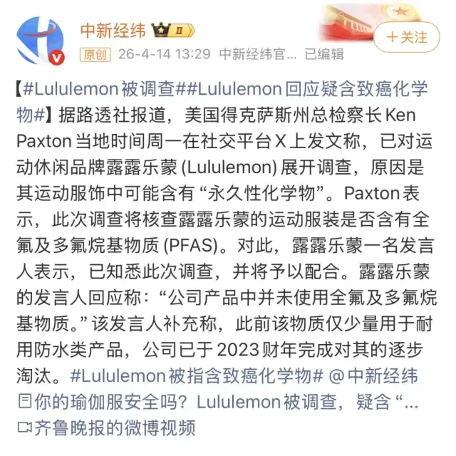 Lululemon中国回应被调查:国内在售产品均不含全氟和多氟烷基物质