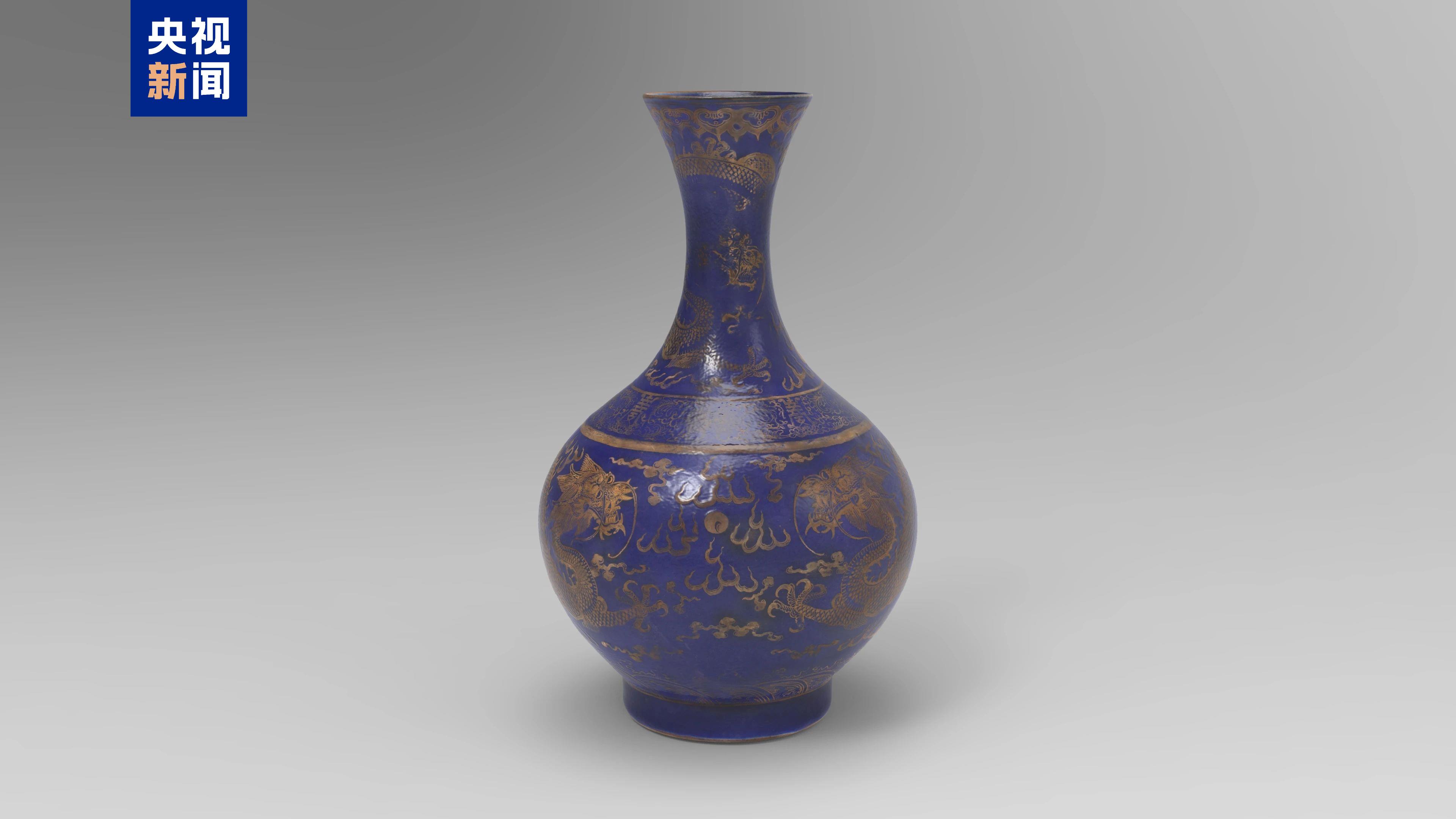 △清乾隆祭蓝釉描金双龙纹赏瓶,烟台市博物馆藏。
