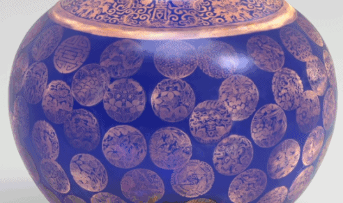 这件蓝金配色的团花赏瓶