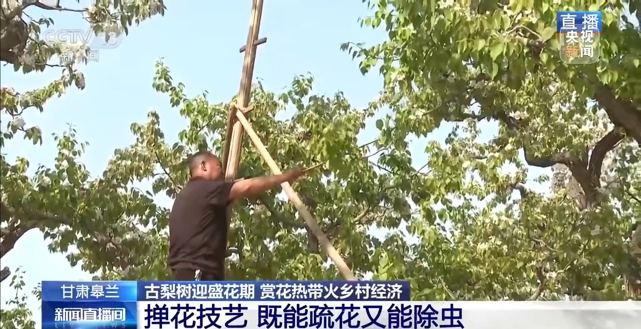 总台记者 崔林欣:梨花盛开,授粉季也就到了。一般的果树,靠自然授粉或者蜜蜂授粉就可以,但是冬果梨自然授粉的坐果率只有10%,所以必须人工授粉,才能保证坐果率。当地果农到现在还保留着传统授粉方式。这里的梨树普遍能长到7到9米高,农户在给花授粉时会踩着古梨园传统工具——云梯。